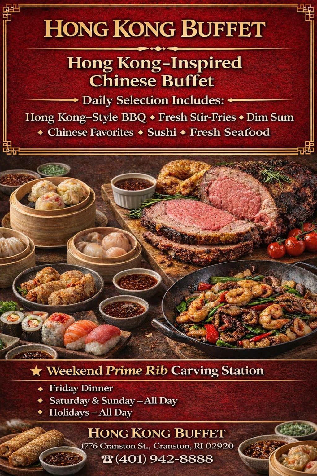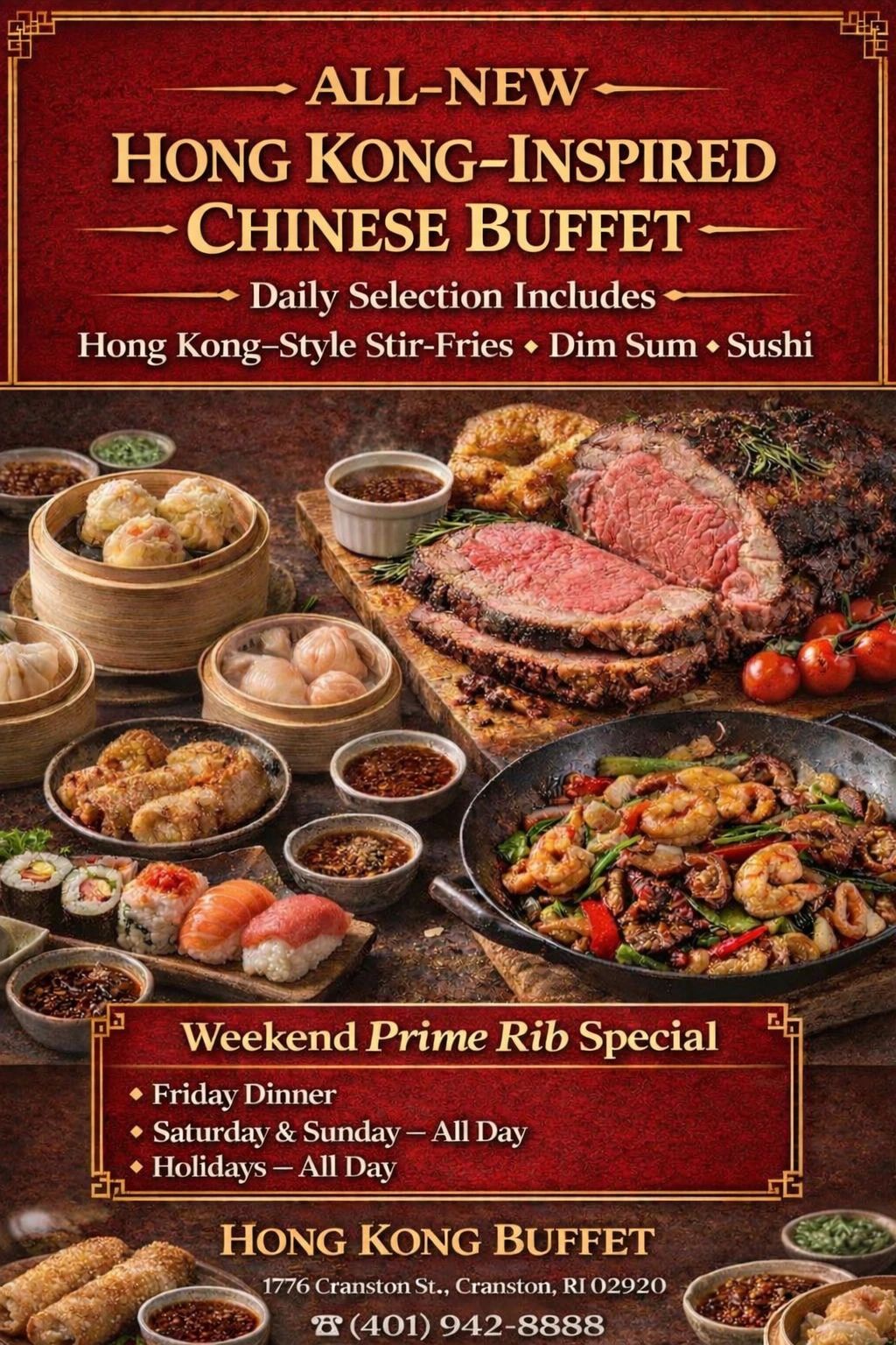 In 1987, Hong Kong Restaurant opened as one of the first Chinese buffets in Rhode Island. Due to the immense amounts of appreciation and recognition from its loyal customers, Hong Kong Restaurant relocated to 1776 Cranston Street, Cranston, Rhode Island and was renamed to Hong Kong Buffet. Hong Kong Buffet’s main focus and mission is solely quality, which separates this buffet from its competitors. It serves excellent dining quality at moderate prices with something for every customer to enjoy. Hong Kong Buffet serves a variety of different food. This includes a variety of exotic sushi, and both American and Asian dishes. Hong Kong Buffet also offers prime ribs during dinner buffet on the weekends and holidays. Hong Kong Buffet’s mission will always be to serve food with superior quality and a variety of food.